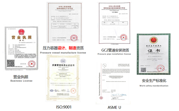 A2壓力容器制造許可證,D1/D2壓力容器設計許可證;GC2管道安裝許可證;ASME U/NB鋼?。籌SO9001、ISO45001、ISO14001體系認證證書等。